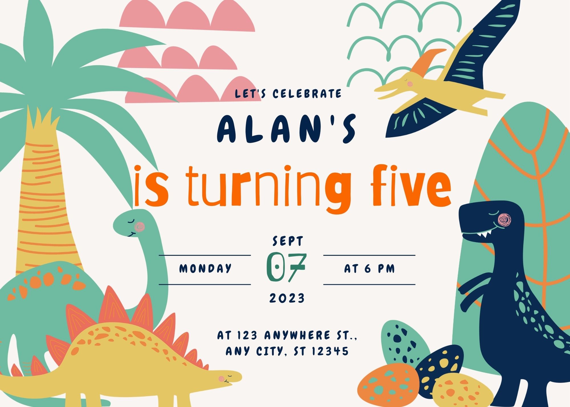 A cute, cartoony dinosaur themed birthday invitation.