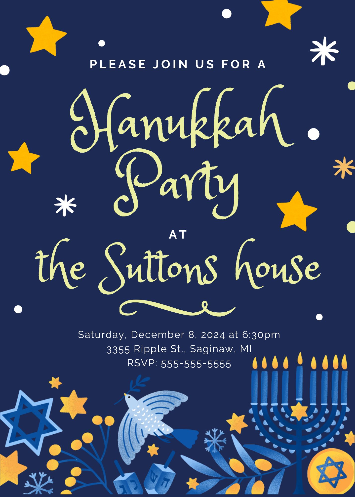 An editable, customizable star themed Hanukkah party invitation template.
