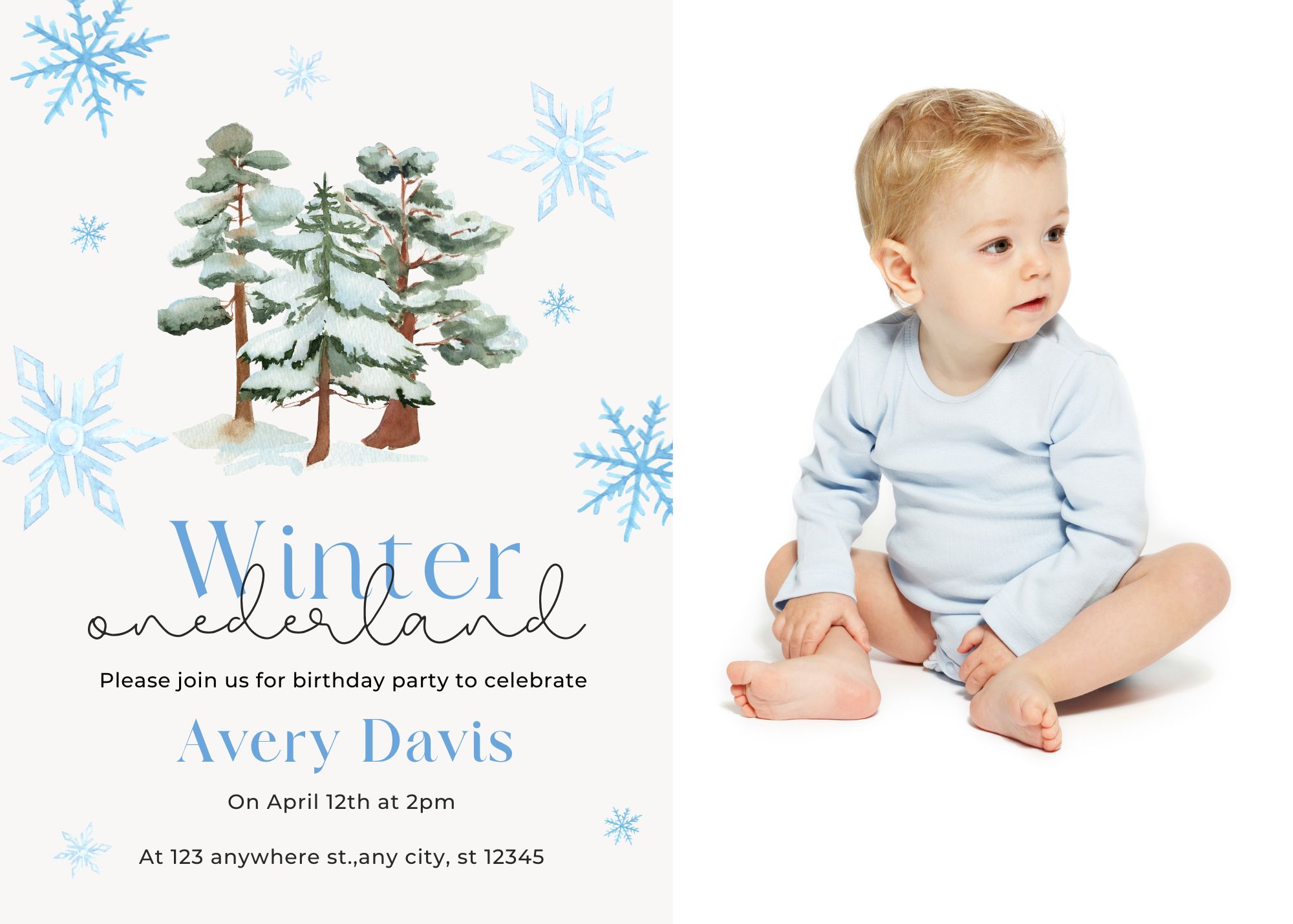 An editable winter theme kids 1st birthday invitation.